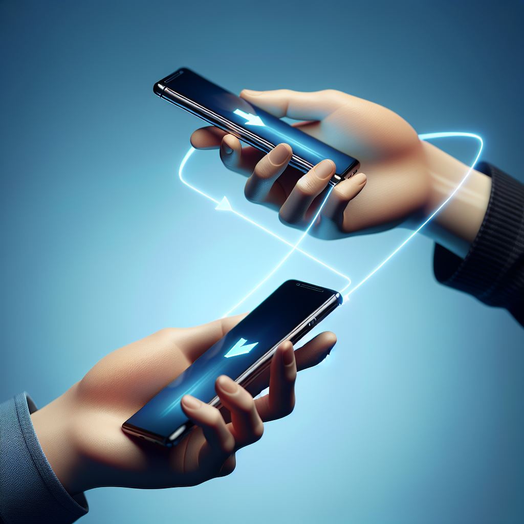 スマホのデータを別のスマホにスキャンして転送している画像。人の顔は写さず、手だけを描く。手は日本人の手。リアルな画像。エフェクト禁止。背景は青色をグラデーション 2025年5月1日 MyiDサイト管理者
